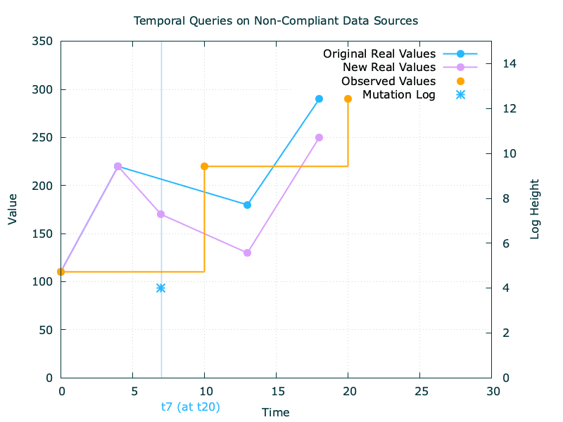 As an example, consider our previous account balance chart, mapping the values at source to our layer. If the source decides to append at t20 a transaction effective at t7, every value after t7 will be updated at source according to the back-dated mutation—invalidating our initial observations in the process.